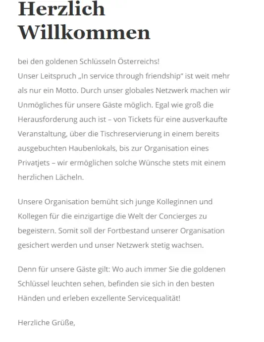 AKTUELLESe YOUR KEY TO Weihnachtsfeier in Wien NEWS / Neuer Bericht der neueste Bericht oder News AKTUELLESe YOUR KEY TO Weihnachtsfeier in Wien unser Verbandsleben…. wird in unseren Berichte dargestellt und festgehalten….. VERBANDSLEBEN UNSER VERBAND unser Verband…. In früheren Zeiten war es der Torwächter, der die Schlüssel zum Haus verwahrte. Er begrüßte Gäste bei der Ankunft und kümmert sich um ihre Bedürfnisse. Im 12. Jahrhundert nannte man ihn schon den "Concierge" und er war ein wichtiges Mitglied des herrschaftlichen Haushaltes durch Jahrhunderte. Damals wie heute war ihre Aufgabe, Gästen den Aufenthalt so angenehm wie möglich zu machen. Die Schlösser und Paläste von heute sind die großen … UNSERE GESCHICHTE unsere Geschichte…. ..… Herzlich Willkommen