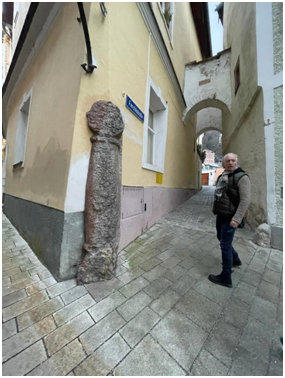 Es ging hoch zum Schöndorfer Platz und am historischen Kirchenpranger vorbei. Dort mussten dereinst kleinere bis mittlere Verstöße nach dem Kirchenrecht abgebüßt werden. Kurz vor der Stadtpfarrkirche platziert, passierten alle Kirchgänger diesen Ort und durften (oder sollten sogar) die schuldige Person verspotten oder mit faulem Obst, Gemüse oder Schlimmerem bewerfen (nur harte Gegenstände waren verboten). Schaurig!